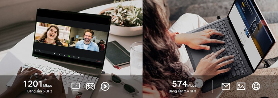 – Tốc độ tín hiệu: 5GHz 11ax: Up to 1201 Mbps (dynamic) – 2.4GHz 11ax: Up to 574 Mbps (dynamic)